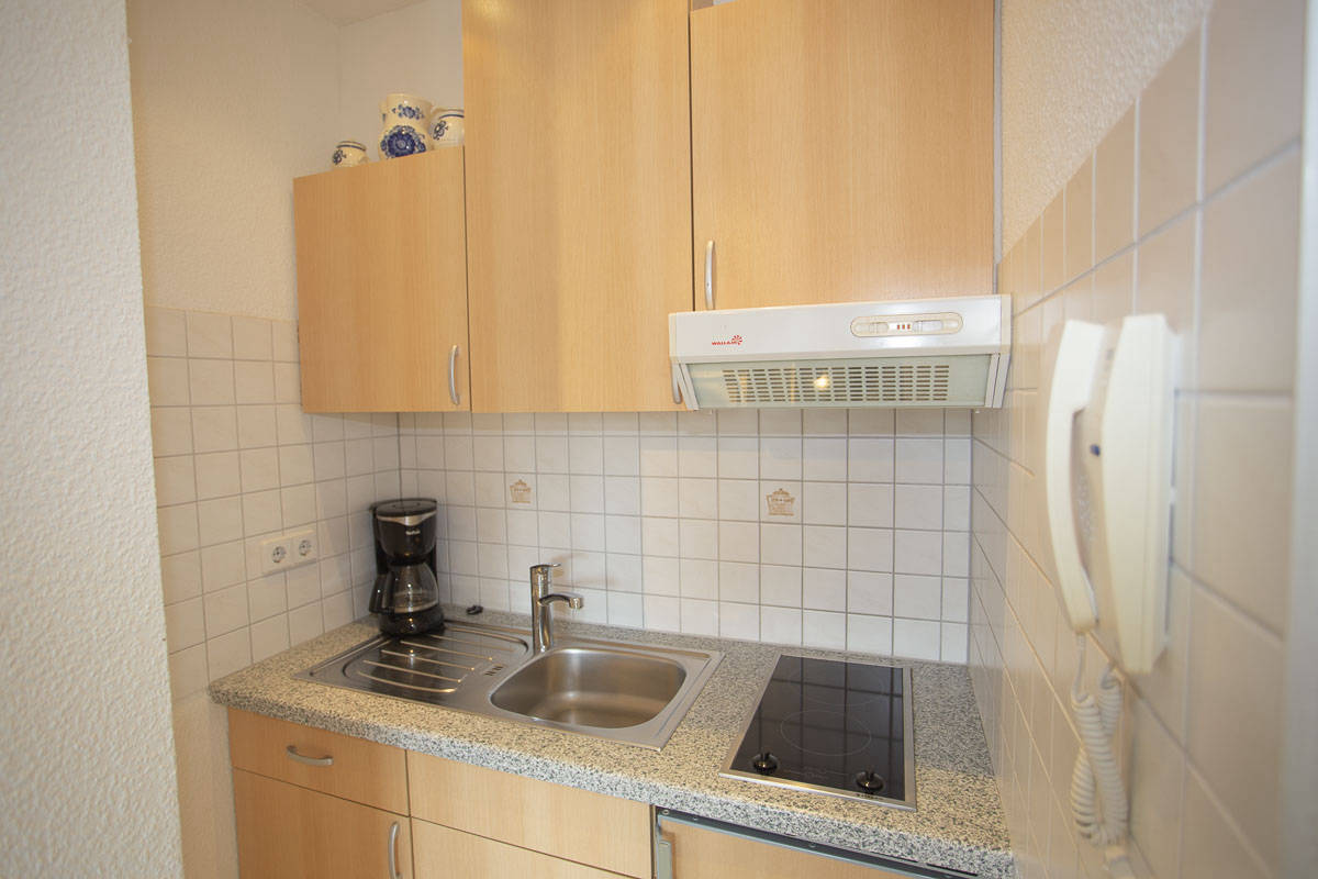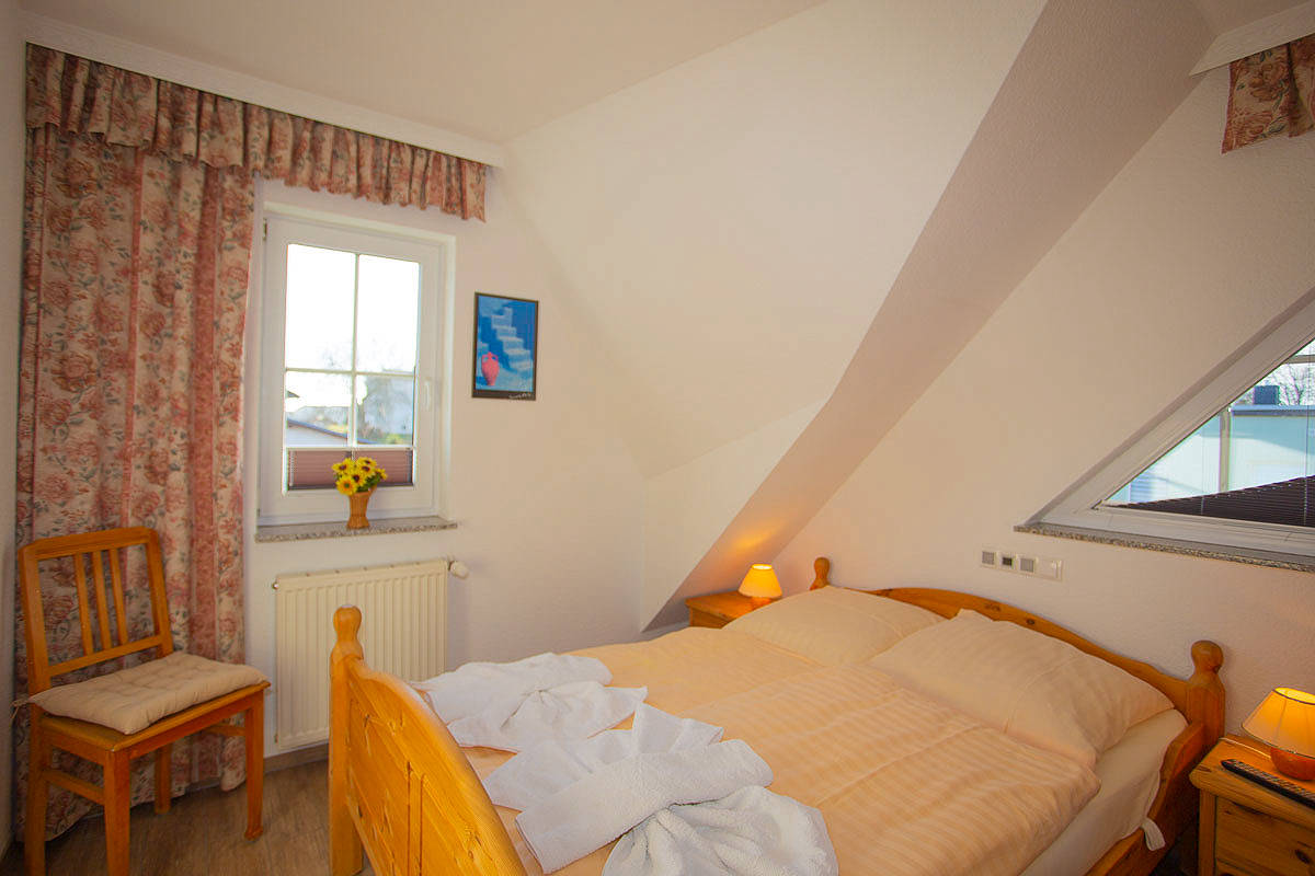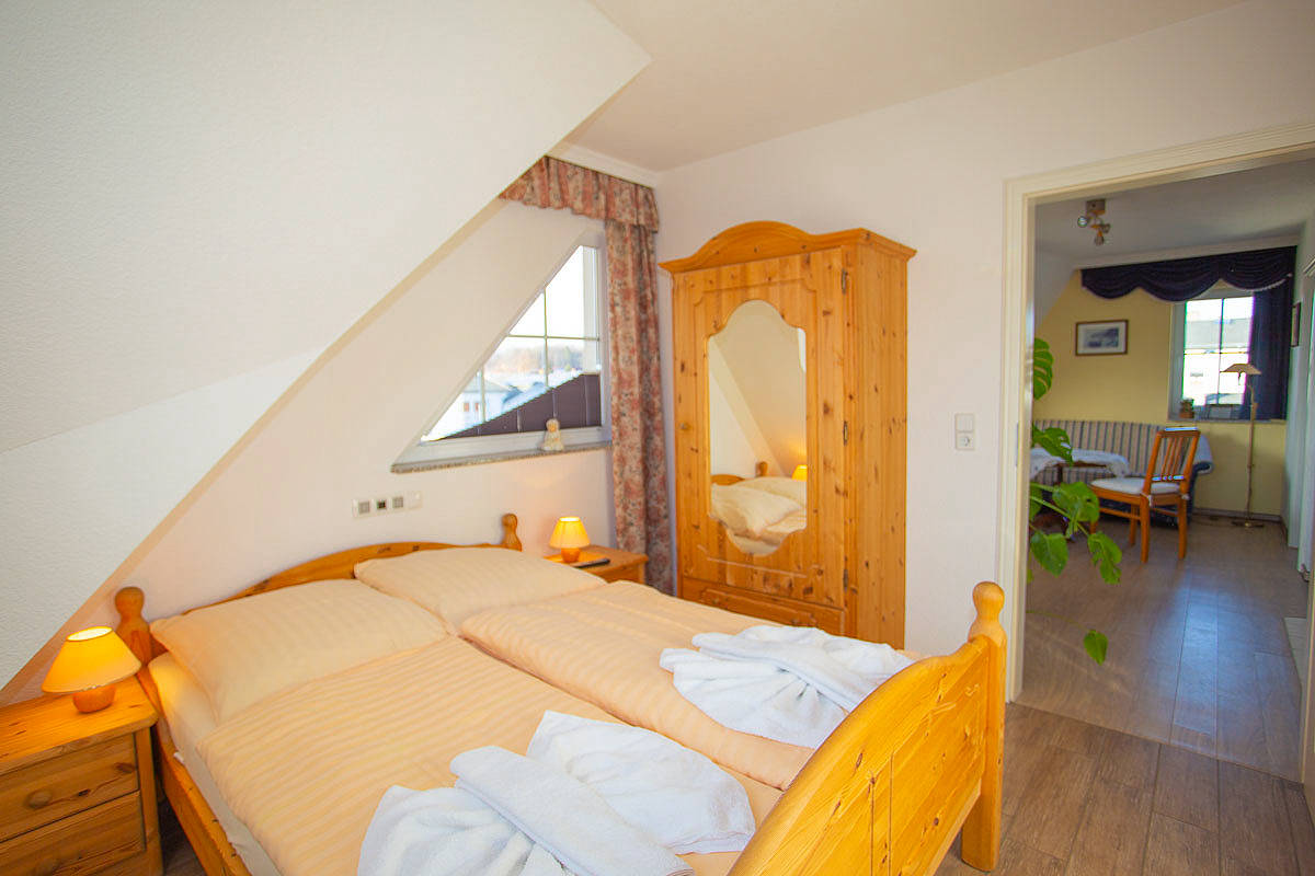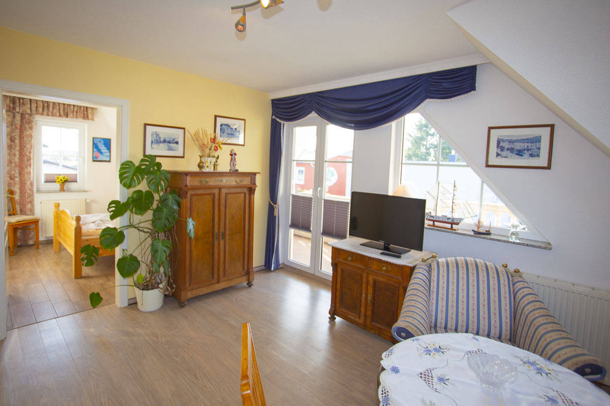 Die haustierfreie 36m²-Wohnung Nr. 1 liegt im Dachgeschoss und besteht aus einem Wohnraum mit Flachbild-TV, Küchenzeile (Kaffeemaschine, Wasserkocher, Toaster, Eierkocher, Kühlschrank, Mikrowelle, E-Herd), einem Bad mit Dusche/WC, Haartrockner, einem separaten Schlafraum mit einem Doppelbett. Es erwartet Sie ein großer West-Balkon mit Nachmittag- und Abendsonne.